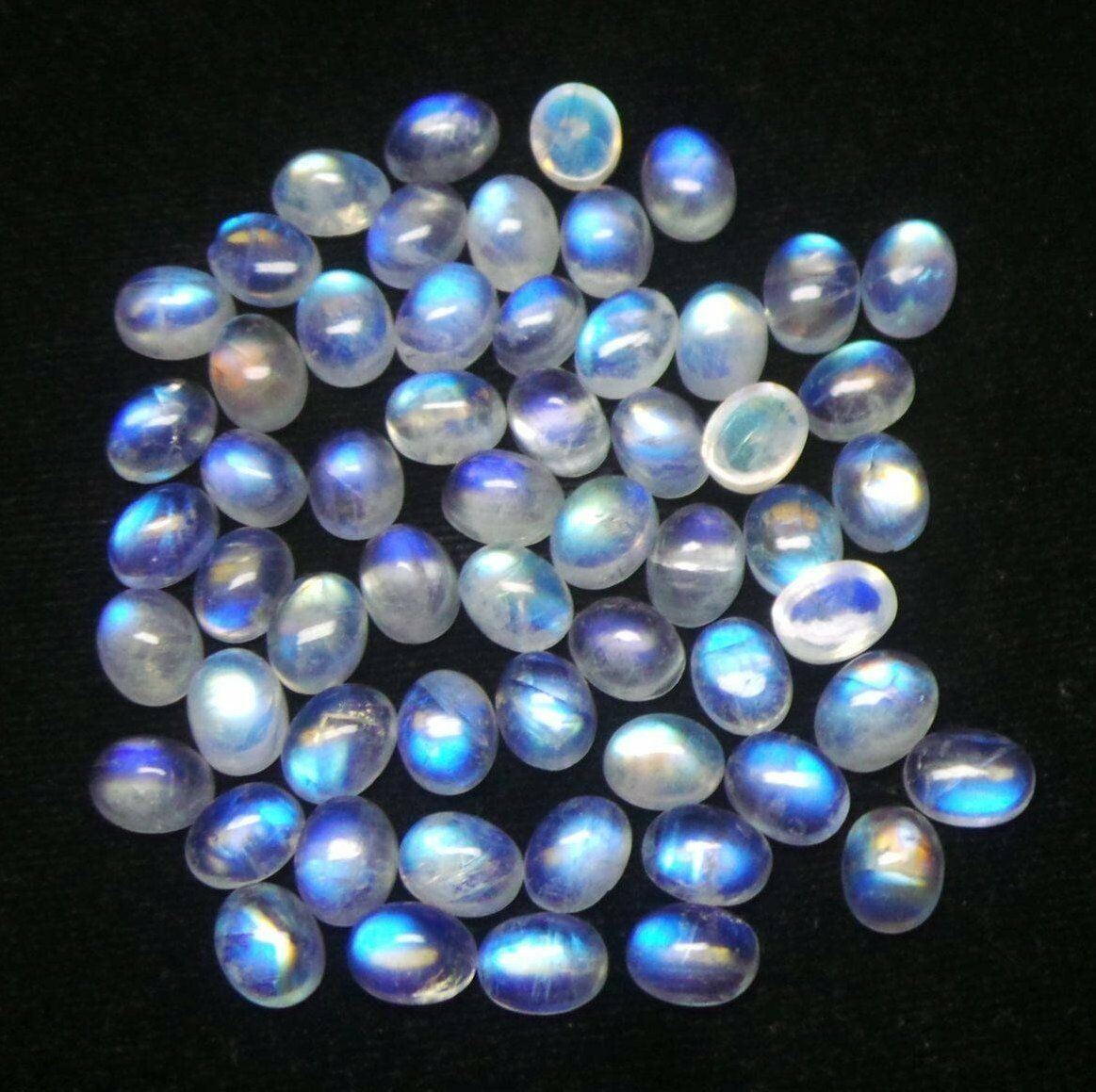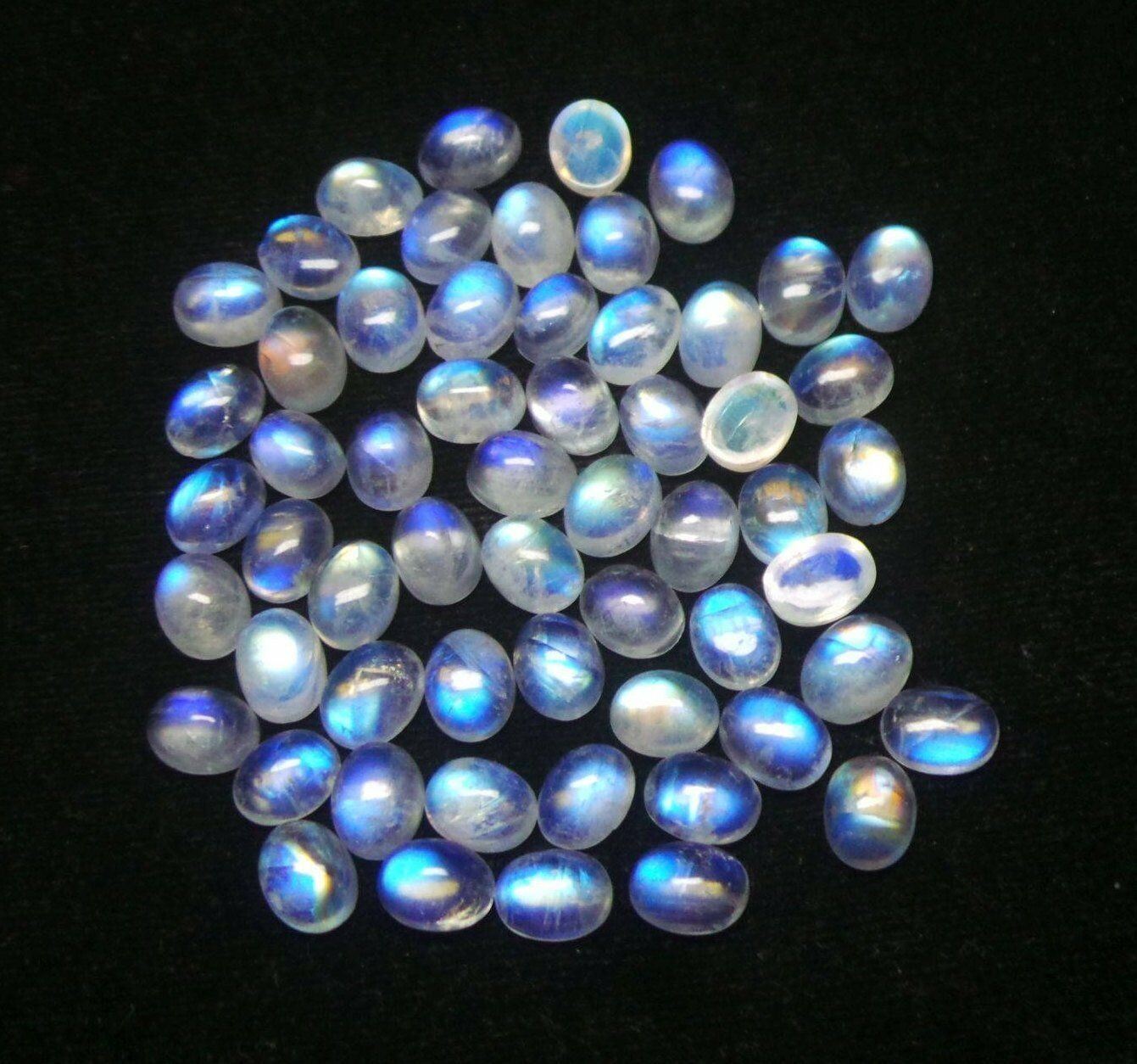 GEMSTONE - RAINBOW MOONSTONE , SHAPE - OVAL CABOCHON , SIZE - 9X7 MM , QUANTITY - 50 PIECES , WEIGHT - 111.00 Cts. , COLOR - RAINBOW , NATURAL/LAB CREATED - NATURAL , TREATMENT - NONE , COUNTRY OF ORIGIN - AFRICA , COUNTRY OF MANUFACTURE - INDIA