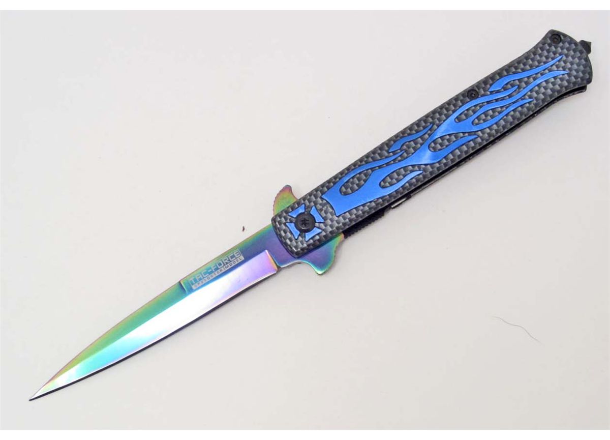4-1/2" closed , 3-1/4" blade. Featuring Rainbow multi color blade with blue flame chopper handle. Includes pocket clip and window breaker at the end of the handle. TF-647BL