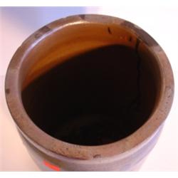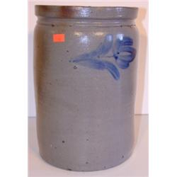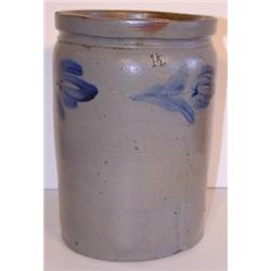 Blue floral decorated stoneware crock. Stamped 1 1/2 on body. Small hairline cracks are visible on body. One measures 3" L and the other measures 1.5" L. 11" H