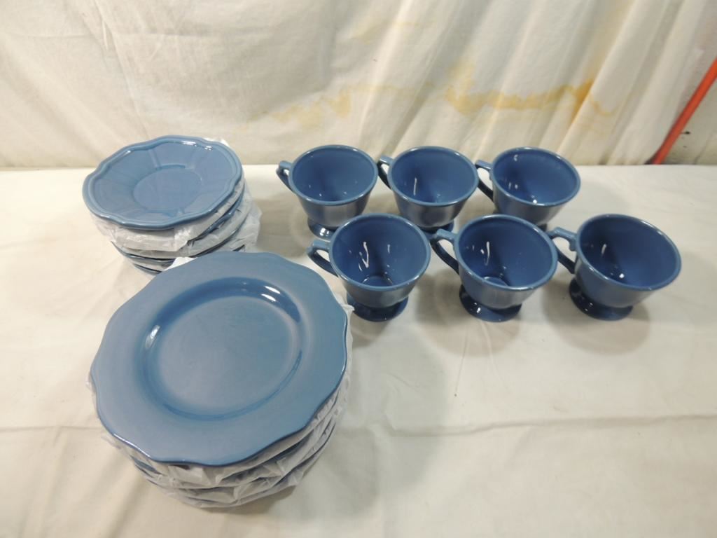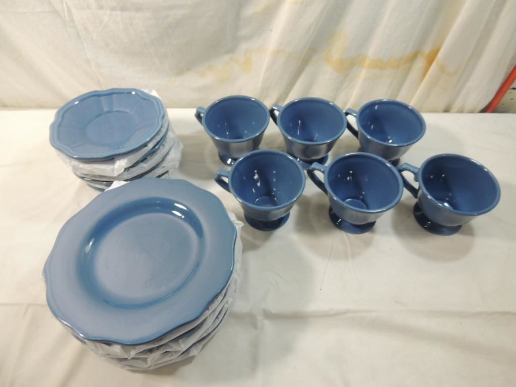 CUPS, MUGS, SAUCERS, PLATES, DINNER SET, DISHES, DINING SET, DINNERWARE SET, PLACE SETTINGS, COUNTRY BLUE, CERAMIC PLATES, AS SHOWN SEE PHOTO FOR MORE DETAILS.