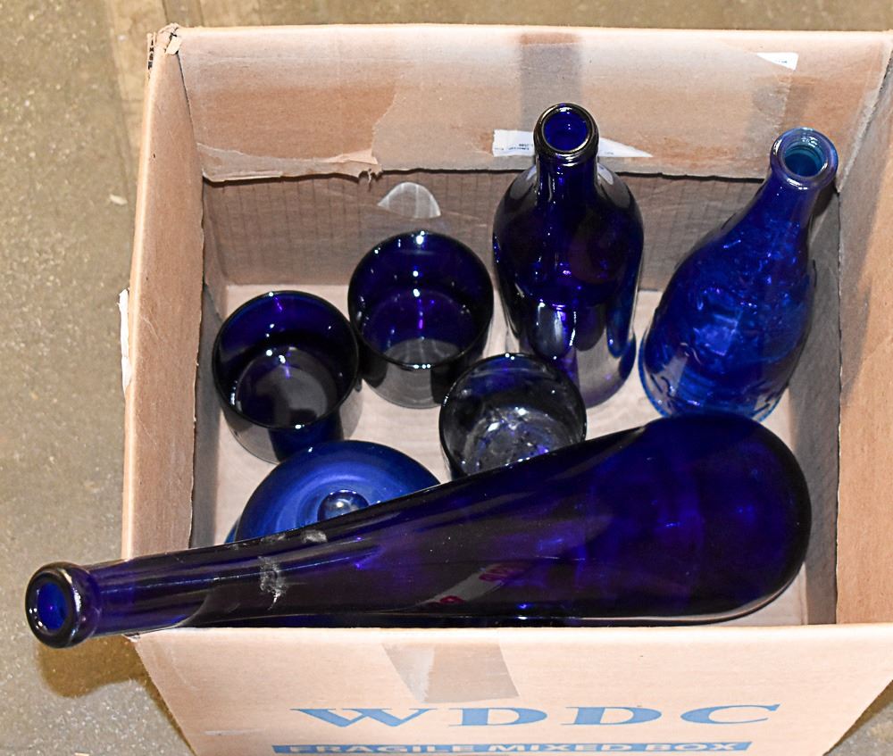 LOT OF BLUE GLASS, 8 PIECES INCLUDING 3 BOTTLES, ONE 18" TALL, ONE BLUE DOME, ONE CANDLE HOLDER, 3 DARK BLUE GLASSES