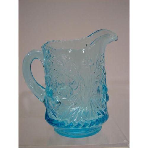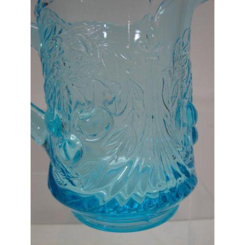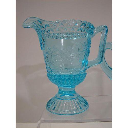 PAIR OF BLUE GLASS CREAMERS. Consists of one pedestal creamer with floral and vine decoration (5.5” H) and one creamer with fruit decoration (4.75” H).