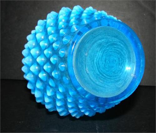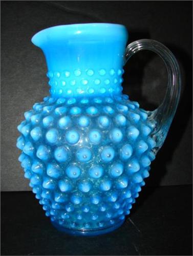 BLUE OPALESCENT GLASS CREAMER. Hobnailed pattern. Has applied ribbed clear glass handle. 5.5” H