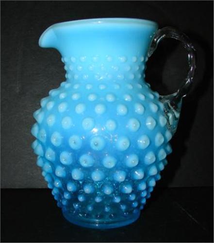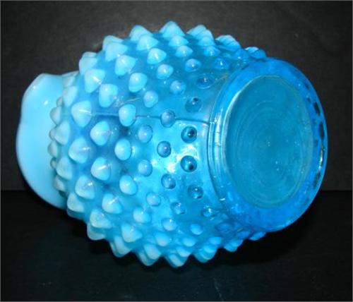 BLUE OPALESCENT GLASS CREAMER. Hobnailed pattern. Has applied clear glass handle. 5.25” H