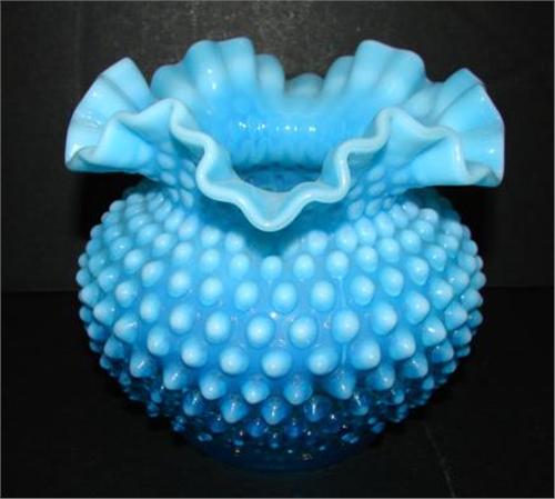 BLUE OPALESCENT GLASS ROSE BOWL. Hobnailed pattern. Fluted top. 4.75” H