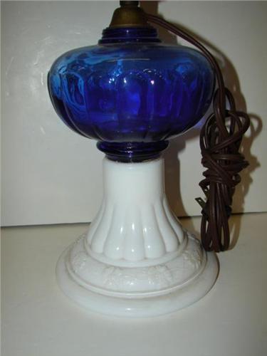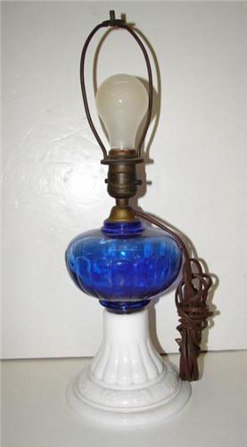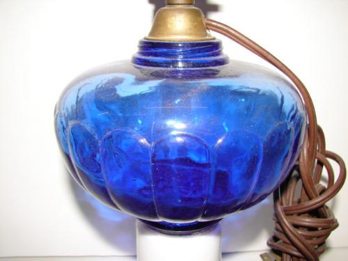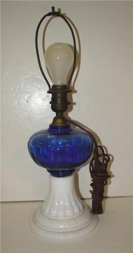 BLUE GLASS TABLE LAMP. Has blue glass bowl attached to white consolidated glass base. Base is floral decorated. Electrified. Bowl looks to have been recently reattached to base. 18” H