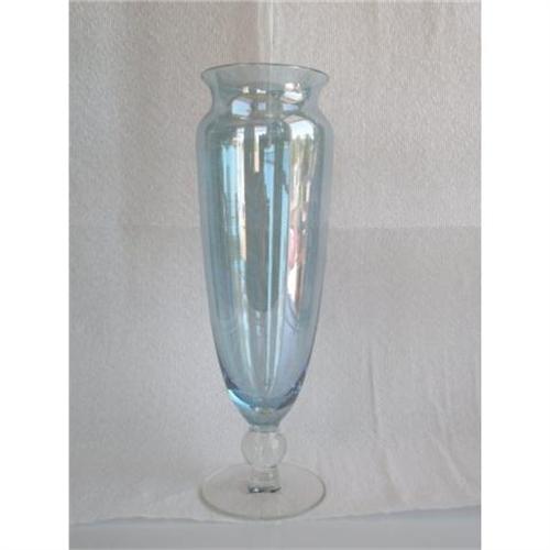 WE PRESENT TO YOU A TALL HAND BLOWN BLUE IRIDESCENT ART GLASS VASE FROM THE STEUBEN ERA. THIS VASE IS SHOWING A ROUND CLEAR FOOT SUPPORTING A CLEAR BALL PEDESTEL W/ A TAPERING TEAR DROP OVID BODY AND A SHORT CYLINDRICAL NECK FLARING OUT AT THE TOP.IN EXCELLENT CONDITION WITH NO DAMAGE.
