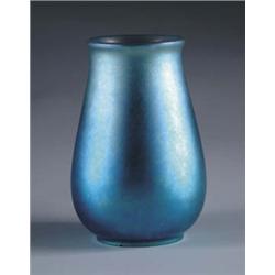 Lot 397 BLUE IRIDESCENT VASE Calcite vase has blue-green iridescence with a blue opal interior. Base is ground flat to reveal calcite. SIZE: 8” t. CONDITION: Very good to excellent. 5-70309