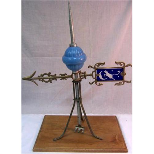 THIS IS A SHORT ALUMINUM TUBE ROD AND FLAT ALUMINUM TRIPOD WITH BLUE MILK GLASS SHINN LINCOLN BELTED LIGHTNING ROD BALL AND BRONZE WEATHER VANE WITH A COW JUMPING OVER THE MOON ETCHED GLASS. THIS IS REALLY A NEAT ONE! YOU LIGHTNING ROD AND BALL COLLECTOR'S CHECK THIS OUT!!!