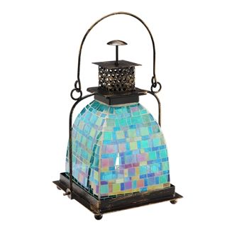 BLUE MOSAIC GLASS LANTERN / CANDLE HOLDER - 10" x 7" x 6" - IRON, GLASS & SHEET METAL