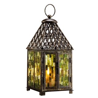 BLUE MOSAIC GLASS LANTERN / CANDLE HOLDER - 16" x 7.5" x 7.5" - IRON, GLASS & SHEET METAL