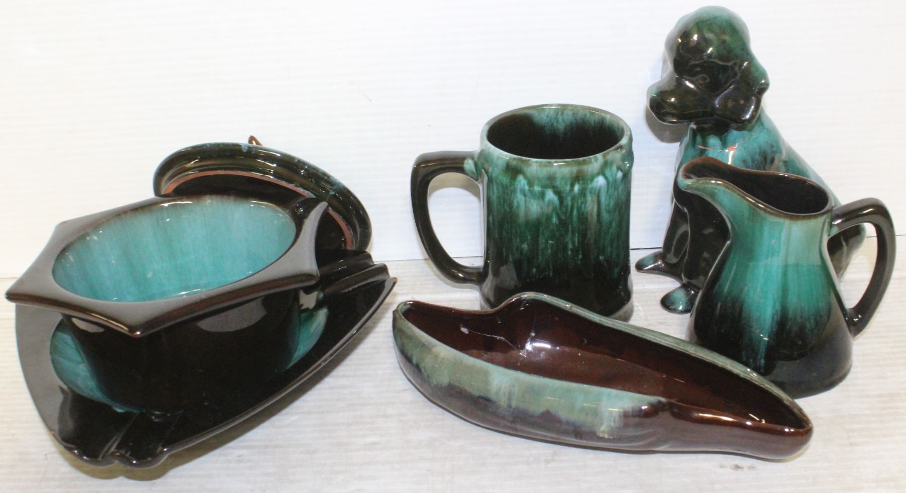 MUG, PITCHER, DOG STATUE, 2 DISHES, 1 POT
