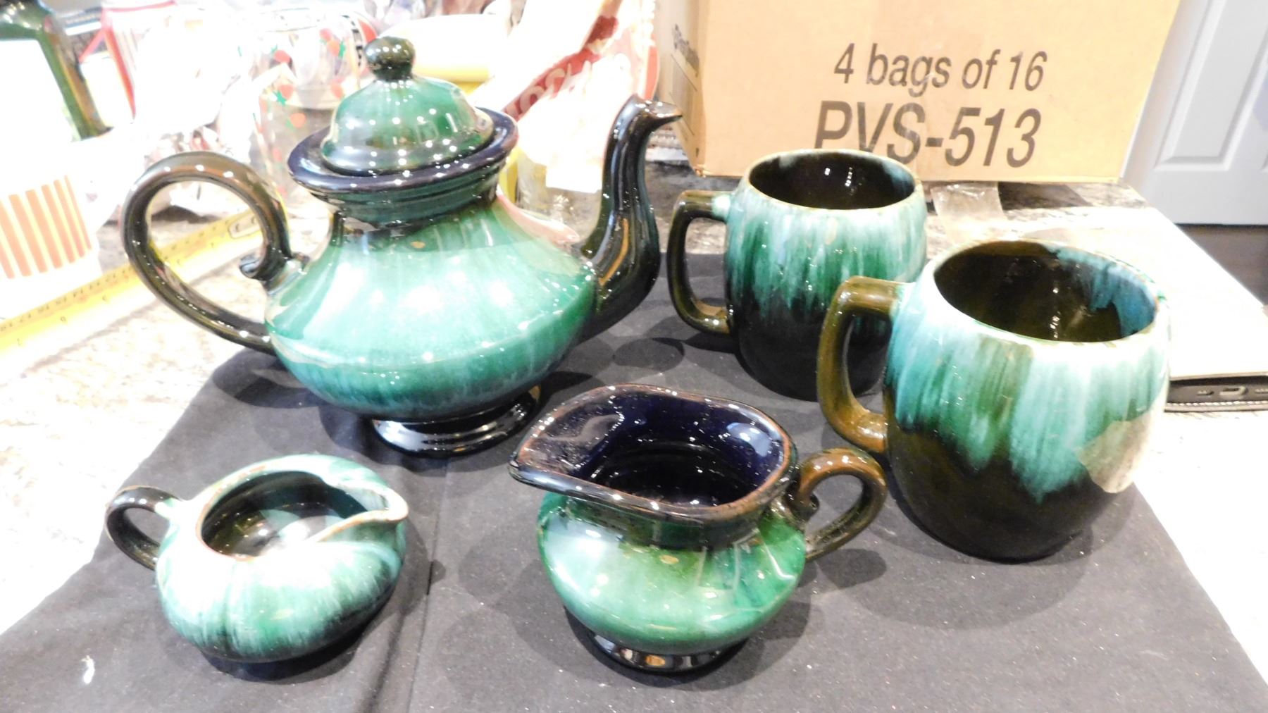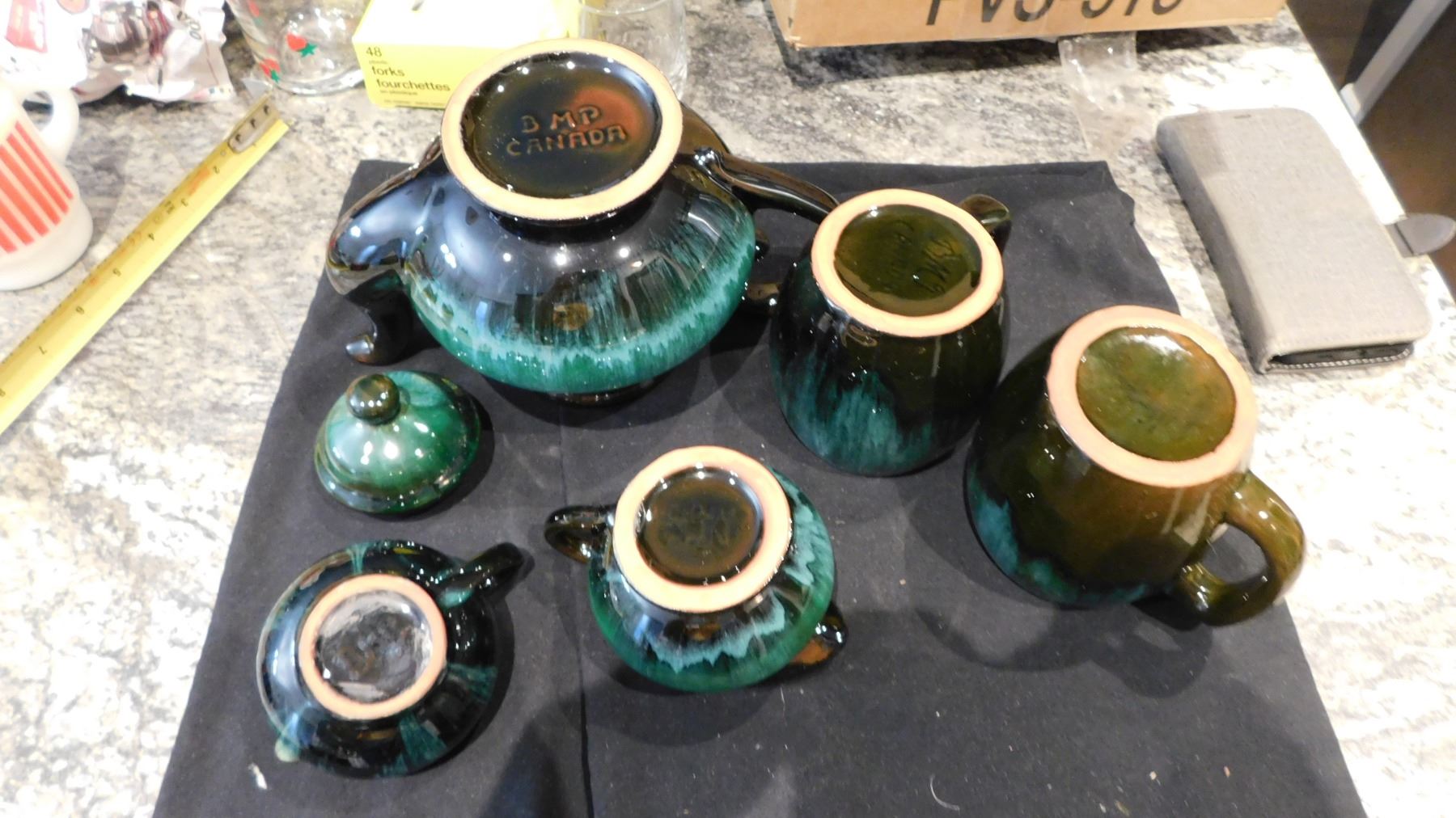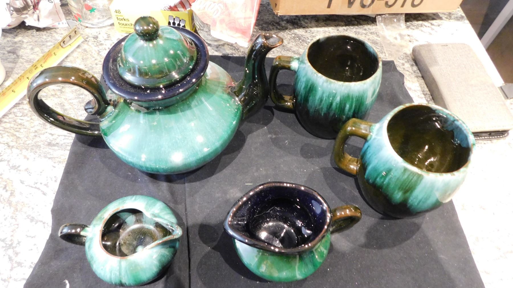 BLUE MOUNTAIN POTTERY, TEAPOT, TWO CUPS, TWO CREAMERS