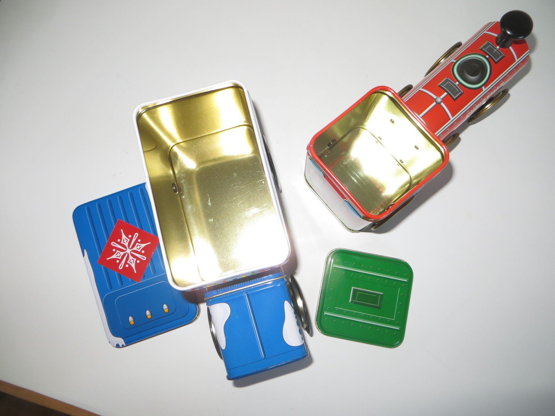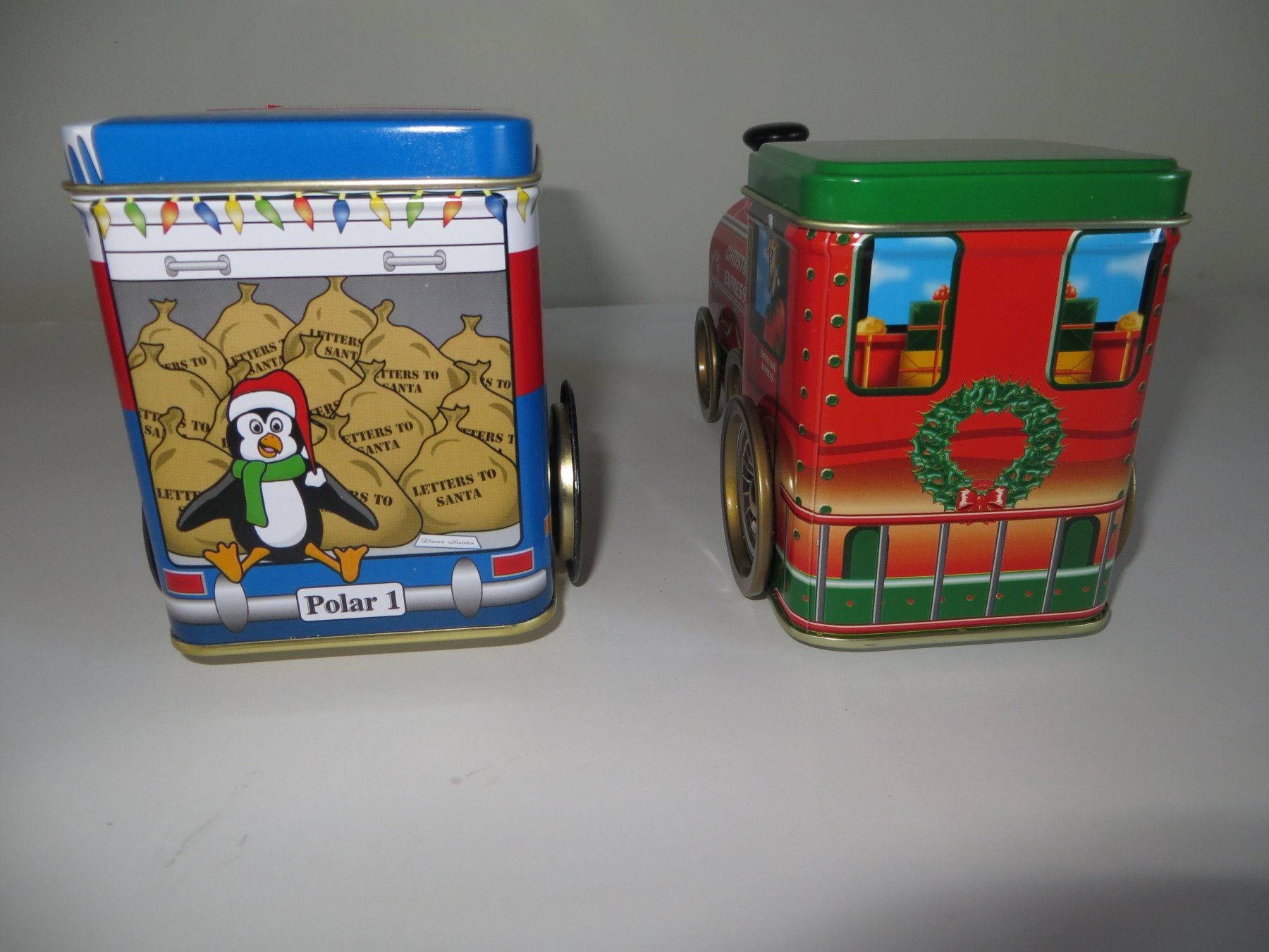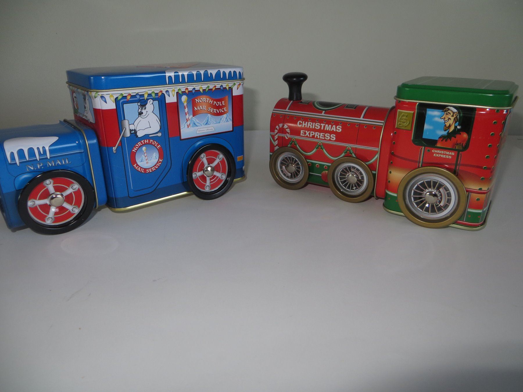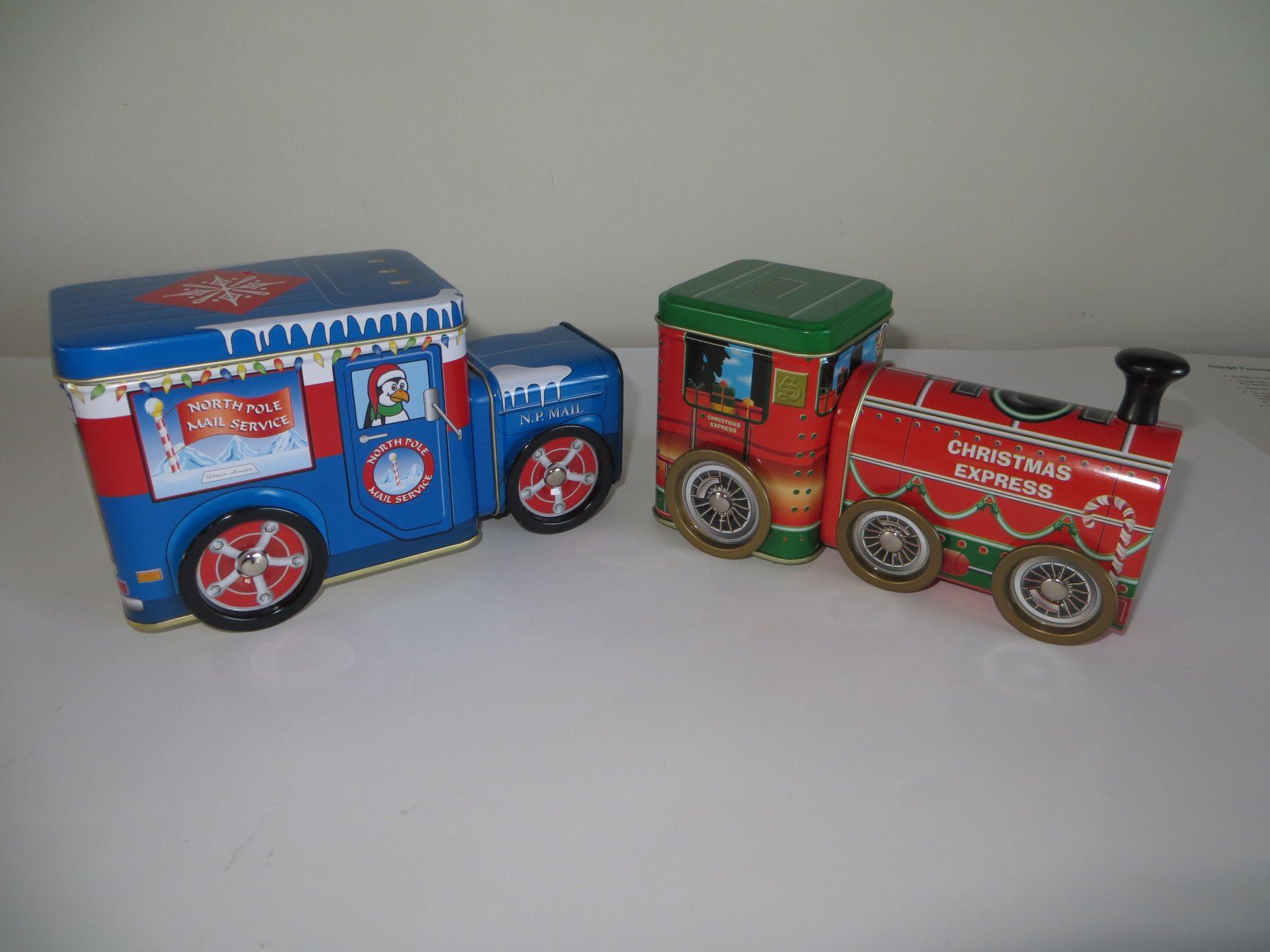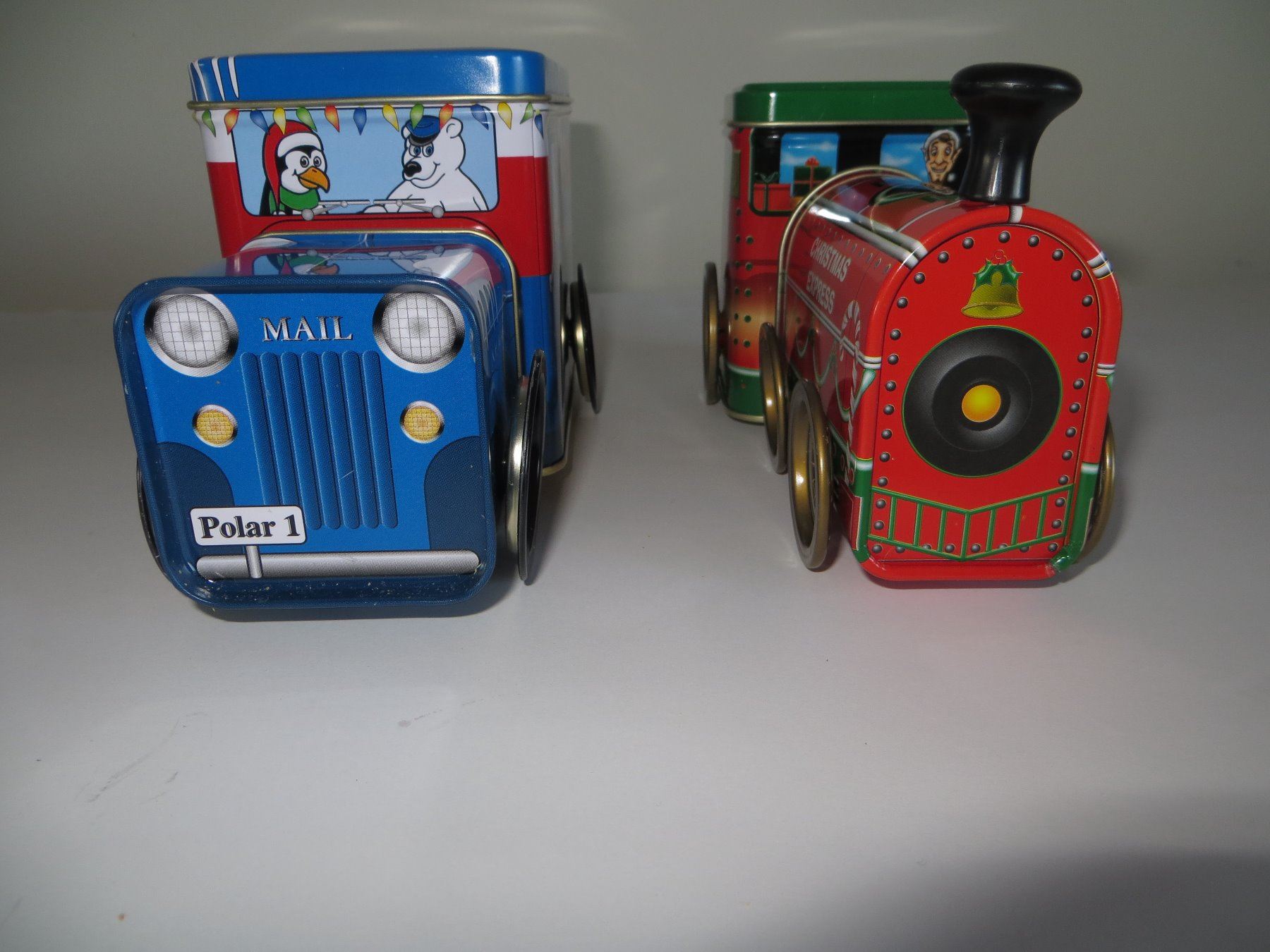 BLUE NORTH POLE TIN MAIL CANDY TRUCK AND RED TIN CANDY EXPRESS TRAIN ENGINE (7.5" LONG X 3" WIDE X 4" HIGH-ROOF AND ENGINE HOODS ARE REMOVABLE) *CANDY NOT INCLUDED*