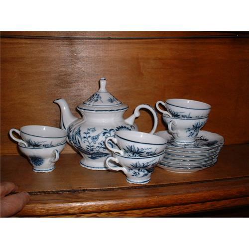 JAPAN MADE, PORCELAIN BLUE ONION COFFEE SET, MINT CONDITION. COFFEE POT, SIX CUPS AND SIX SAUCERS. I THINK, BUT WILL VERIFY AT TIME OF SALE, THAT S/H/I WOULD BE ABOUT $20.00 IN THE USA.
