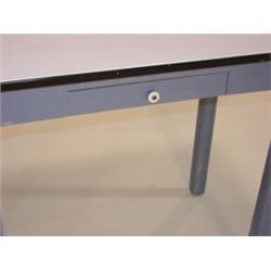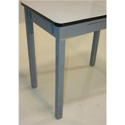 Blue painted agate ware table with single drawer. Light surface scratching to top. Light wear and scratching to paint. Porcelain knob on drawer. 30.5" H, 32" x 21"