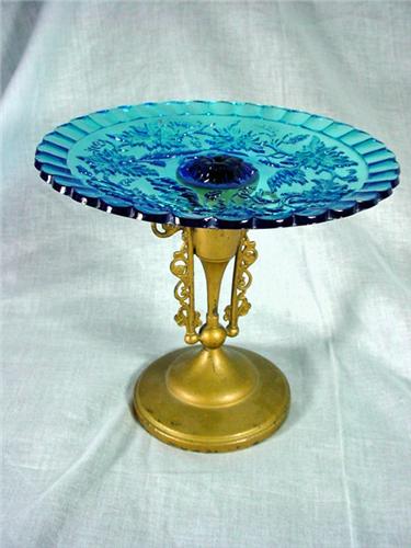 BLUE PATTERN GLASS DISH ON PEDESTAL BASE OF BRASS.