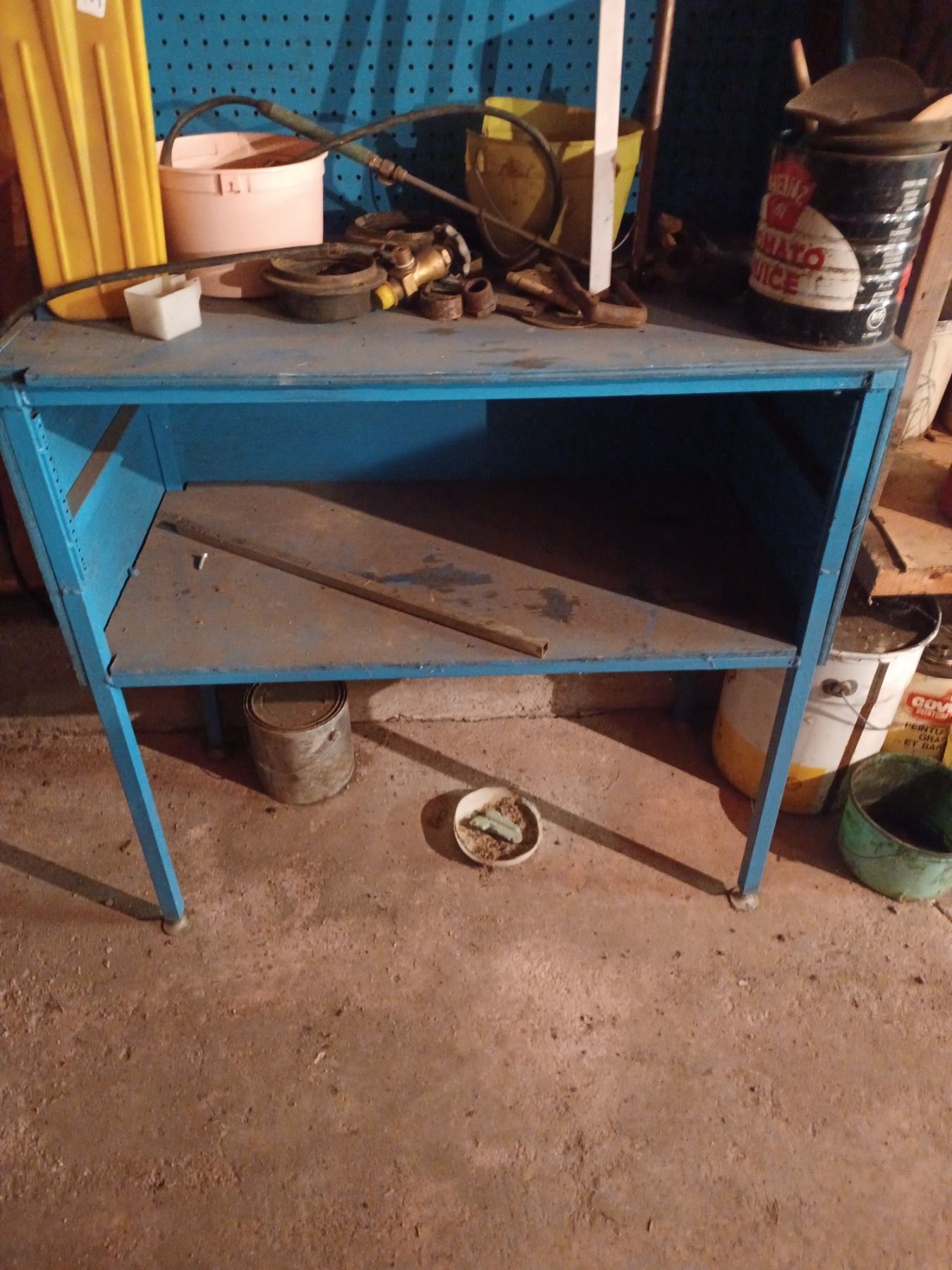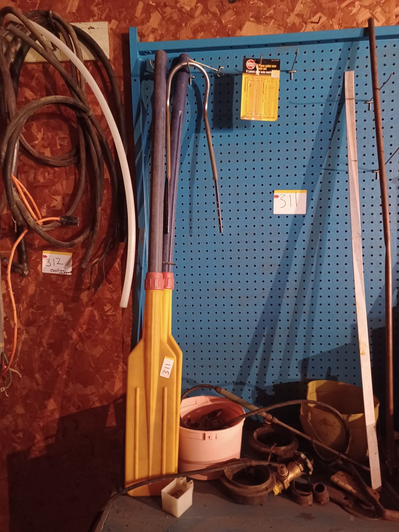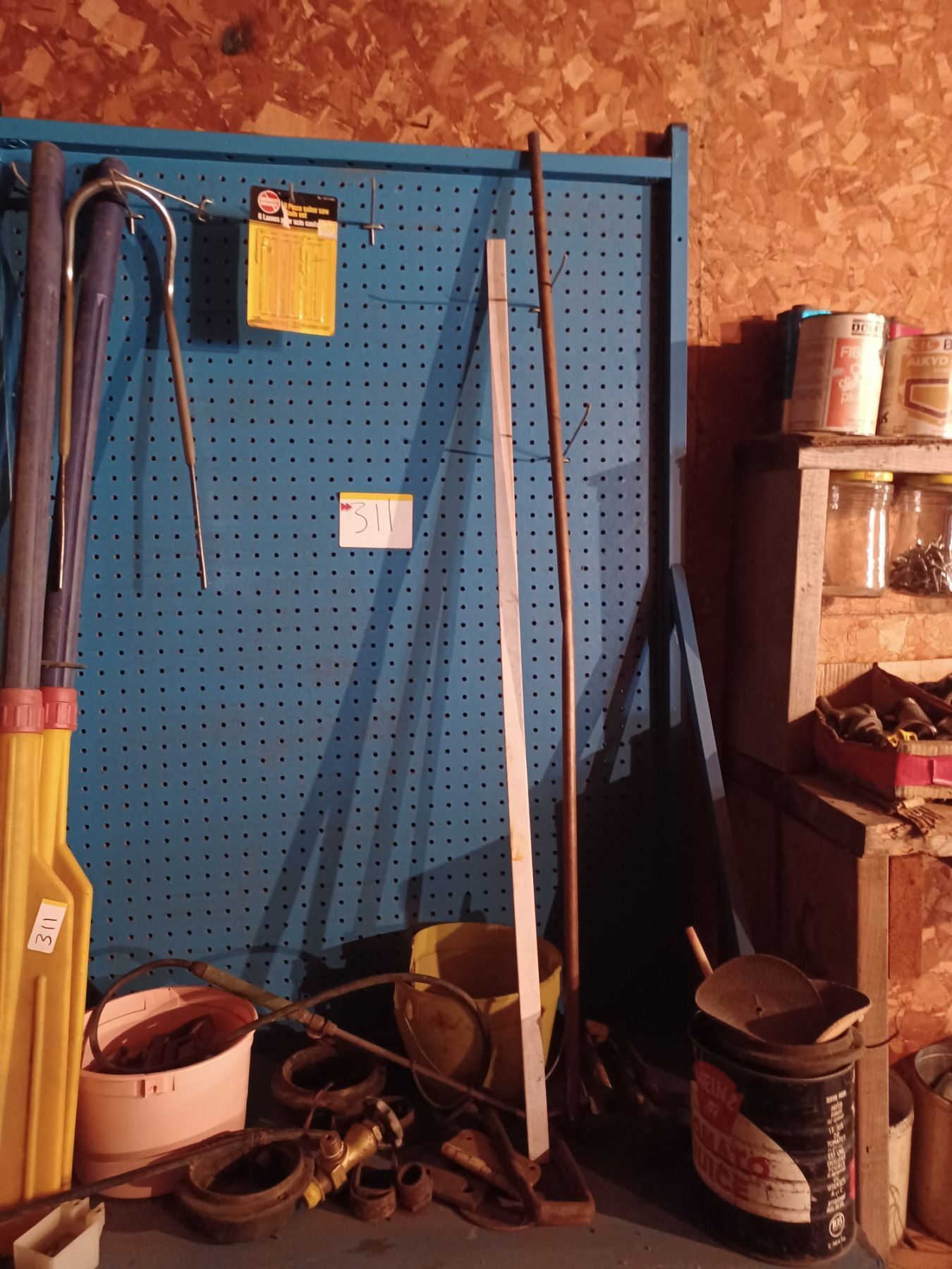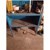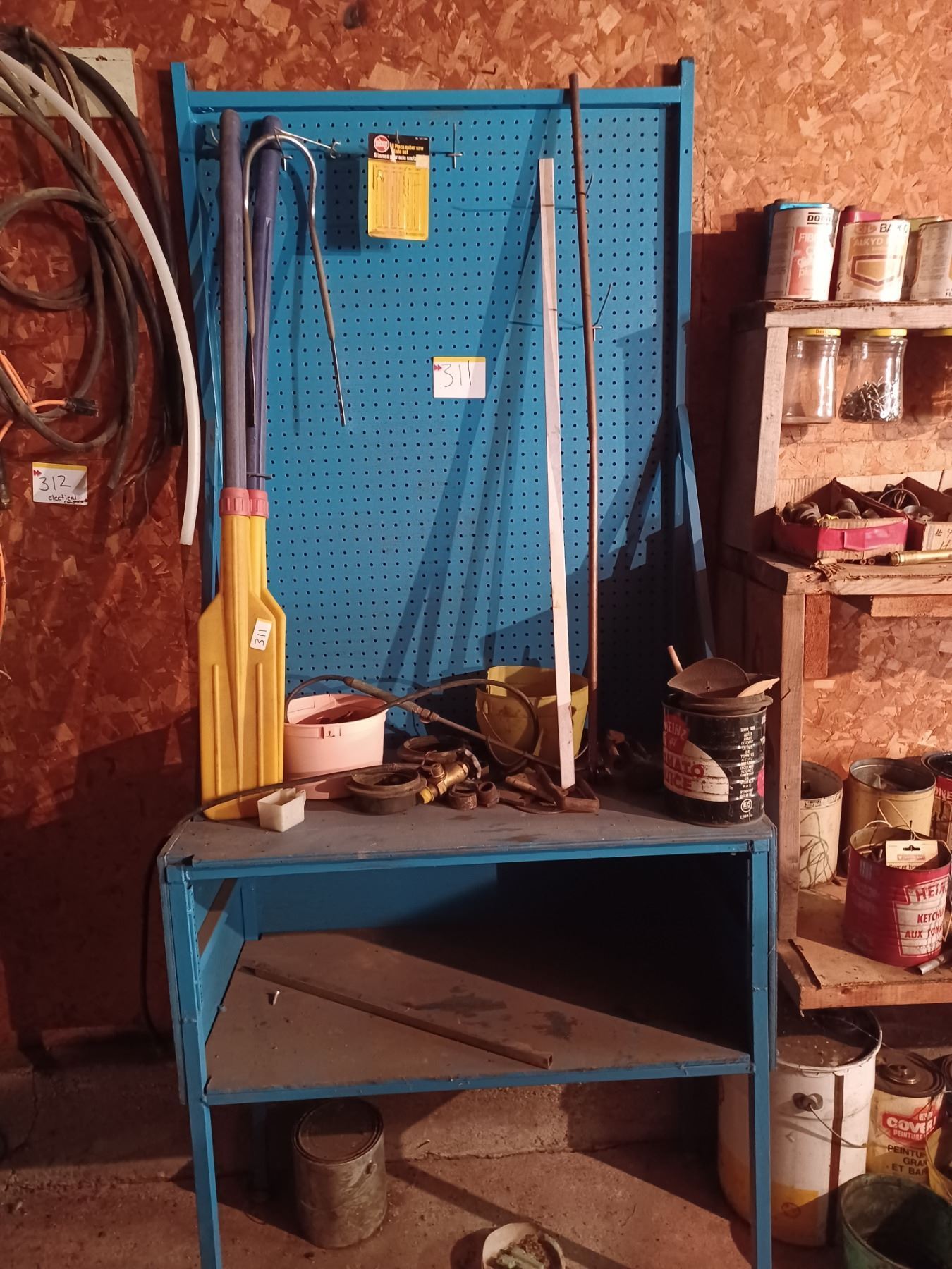 BLUE PEG BOARD WORK TABLE, PADDLES AND CONTENTS