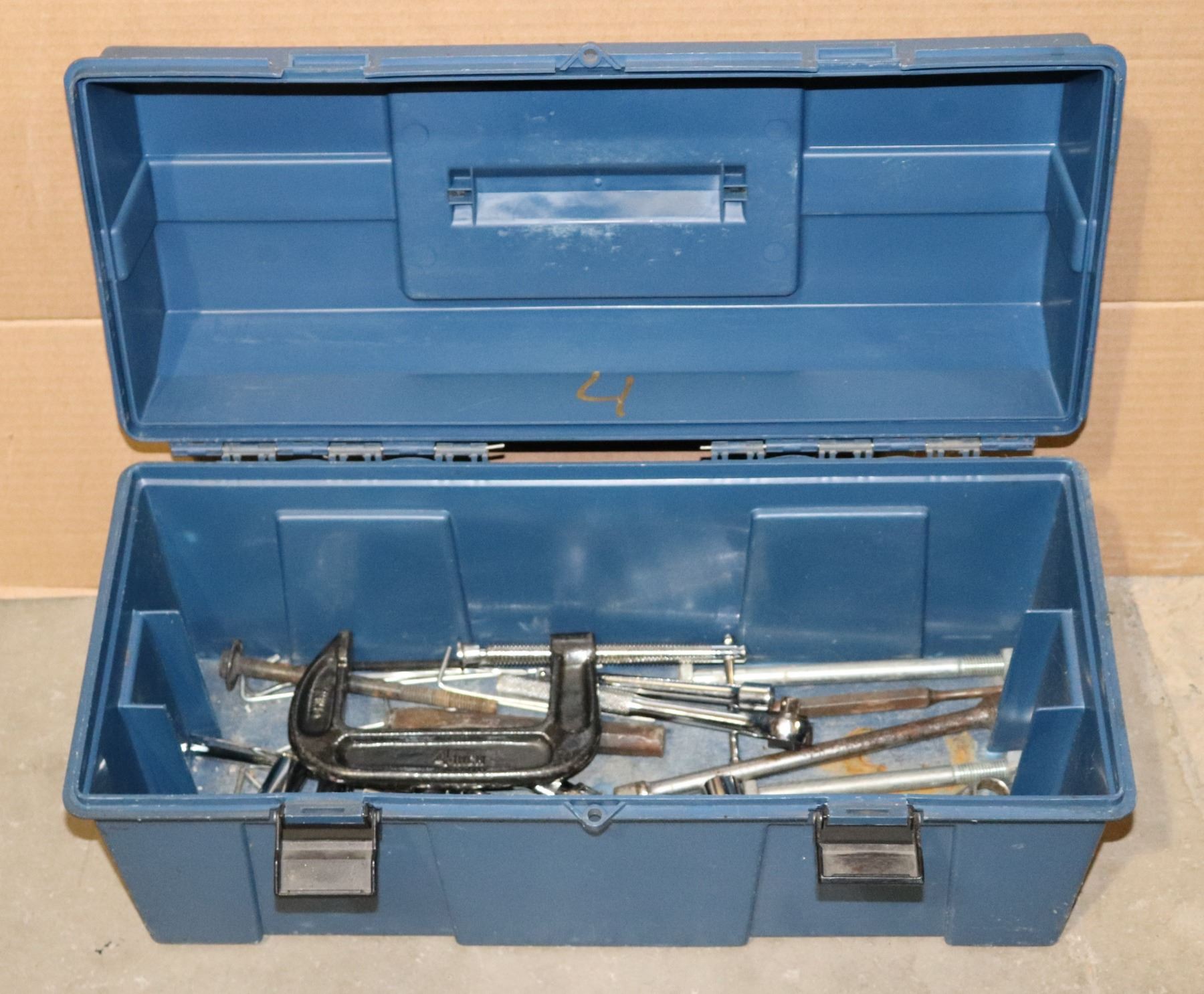 BLUE PLASTIC TOOL BOX WITH 4" C CLAMP, SOCKETS,