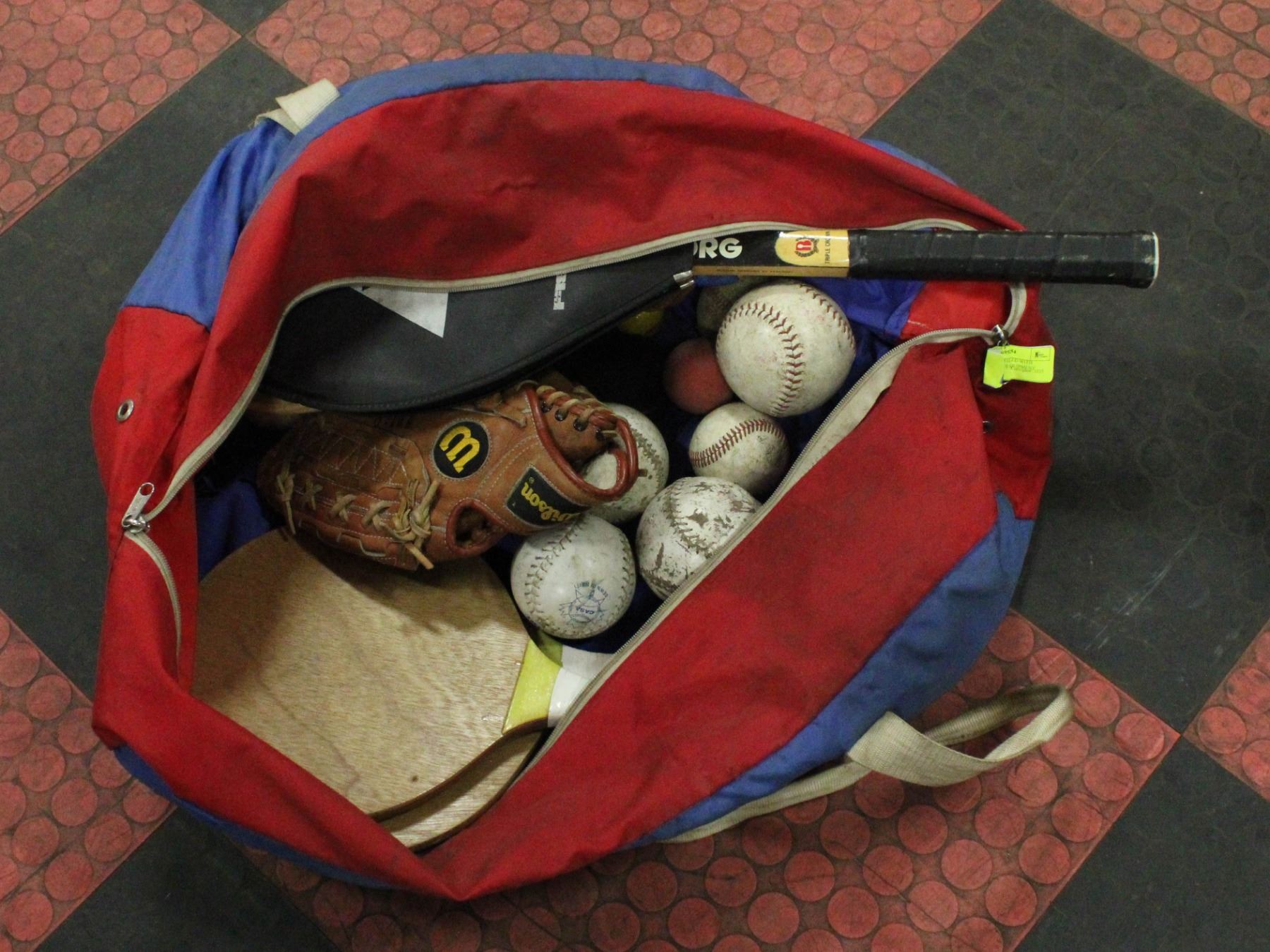 BLUE RED BAG FILLED WITH VINTAGE SPORTS EQUIPMENT