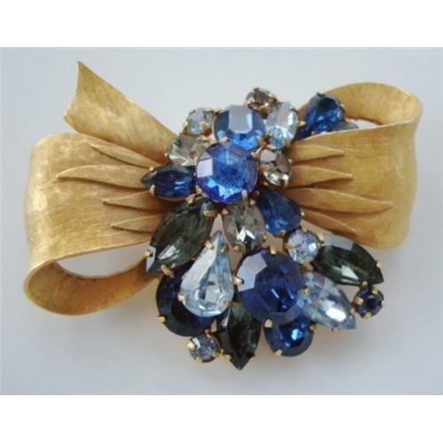 For sale I am offering a very gorgeous and pretty Etched Goldtone Bow Brooch. It has a large cluster of shades of blue rhinestones at the center. It is signed Francois which is a Coro Signature. There are 3 shades of blue rhinestones and some smoke-colored ones as well. They are virtually all shapes. There are round, oval, teardrop and marquises. All the stones are prong set. There are no missing, discolored, loose or dead stones. The front and back are in excellent condition. Is has a nice goldtone finish to it. The back pin is in excellent condition. It?s securely fastened and locks inside the clasp securely.