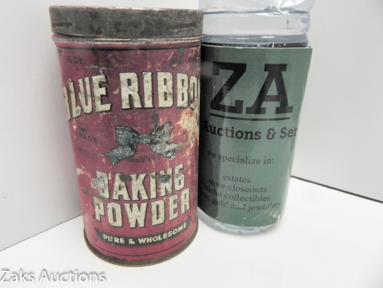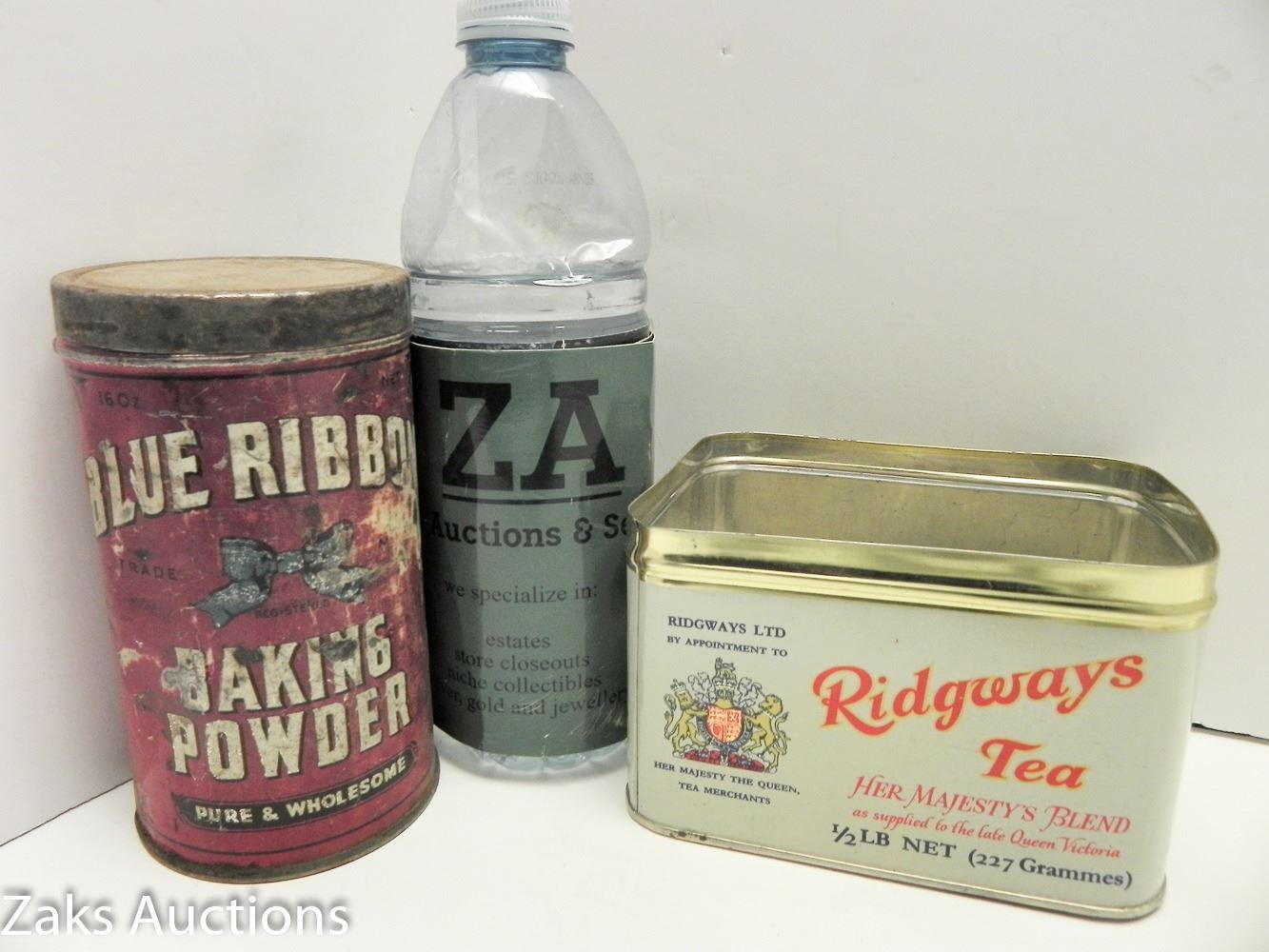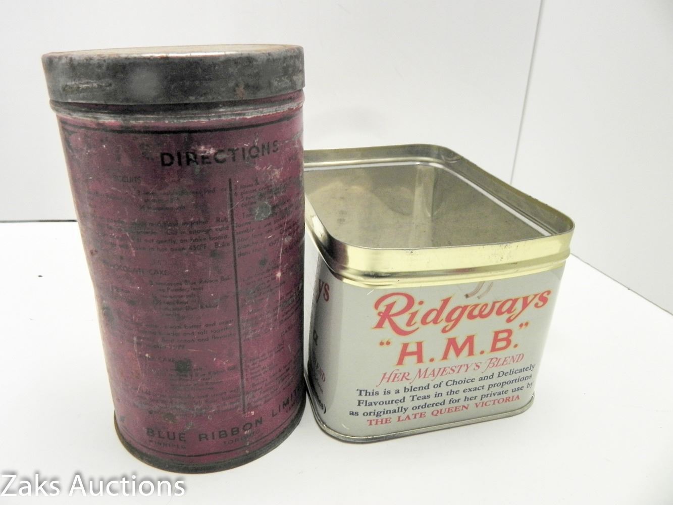 BLUE RIBBON BAKING POWDER, RIDGWAYS TEA (NO LID) TINS