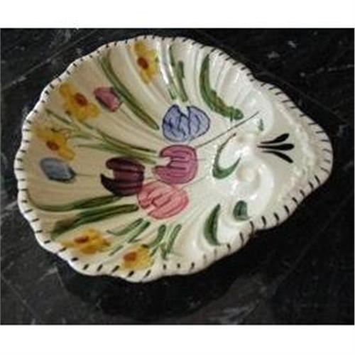 BRIGHT AND BOLD BLUE RIDGE DEEP SCALLOPED RELISH DISH. THIS ONE IS THE BRIGHTEST AND BOLDEST OF COLORS SUCH AS PURPLE, BLUE, YELLOW AND SMALL BLACK STRIPES ON THE RIM. THE PATTERN IS CALLED EASTER PARADE. QUITE LARGE AT 9" x 9"