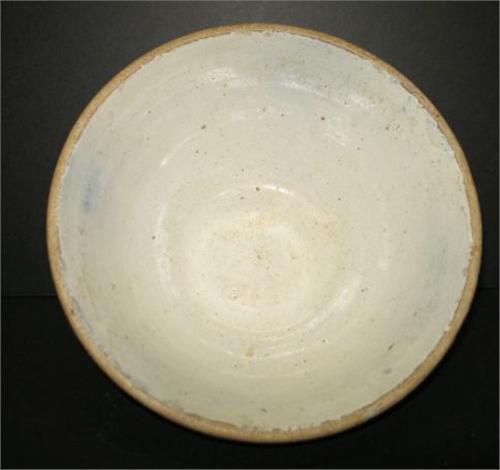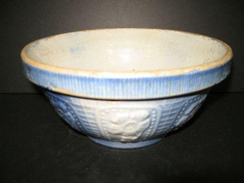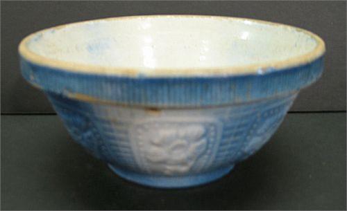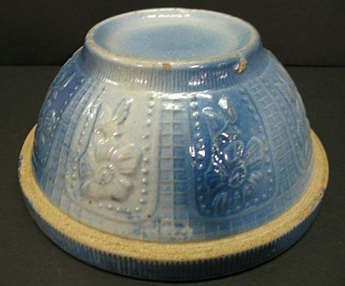 BLUE SALT-GLAZED MIXING BOWL. Embossed floral decoration around exterior. Excellent condition with no chips or cracks and only a few small areas with loss to glaze. 4.5” H, 10” Dia.
