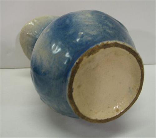 SMALL BLUE SALT-GLAZED PITCHER. Embossed floral decoration on body. Shows some firing cracks and crazing to interior. Excellent condition. 7” H