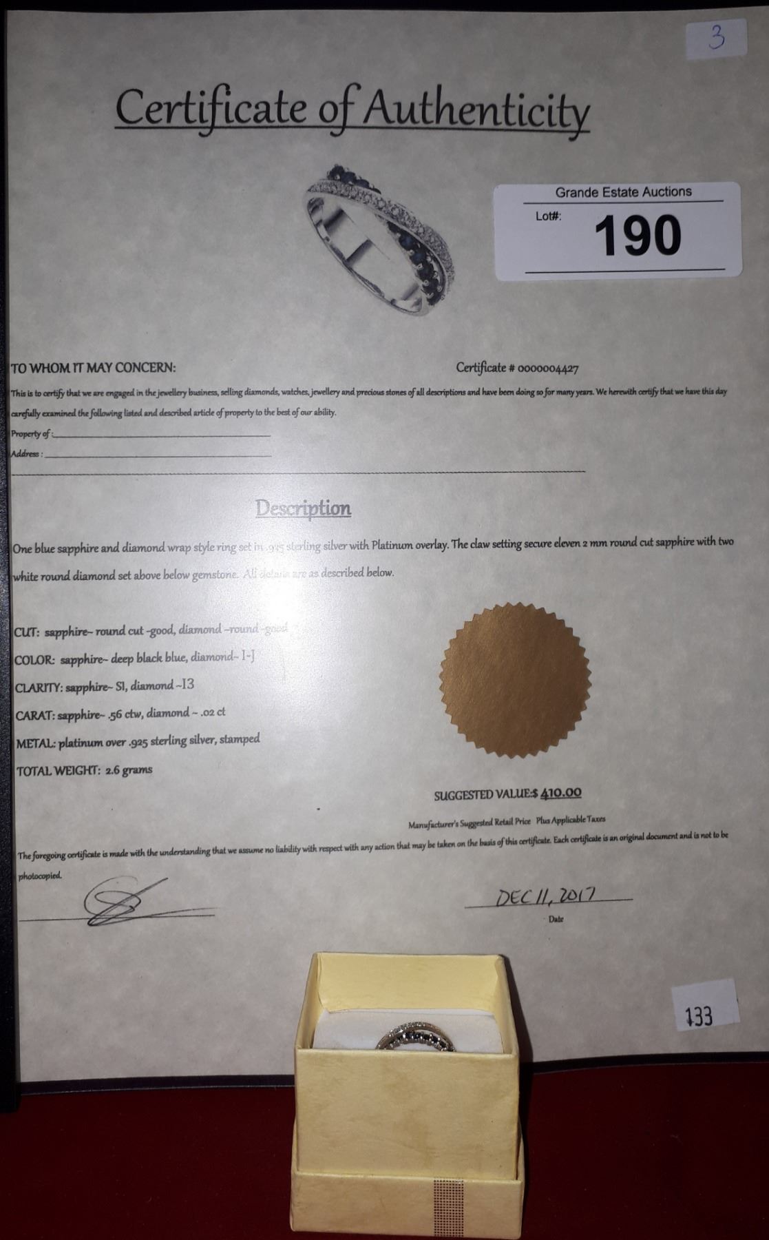 If for any reason, Grande Estate Auctions is unable to deliver any or all of an awarded lot or title thereof, the sole liability of Grande Estate Auctions shall be the refund of any monies paid on the lot.