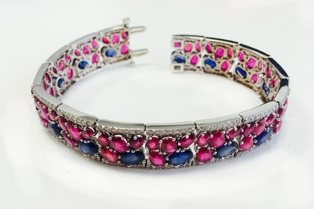 BLUE SAPPHIRE 15.15CT / RUBY 26.22CT, 14K W/G BRACELET 25.87GRAM / DIAMOND 2.65CT