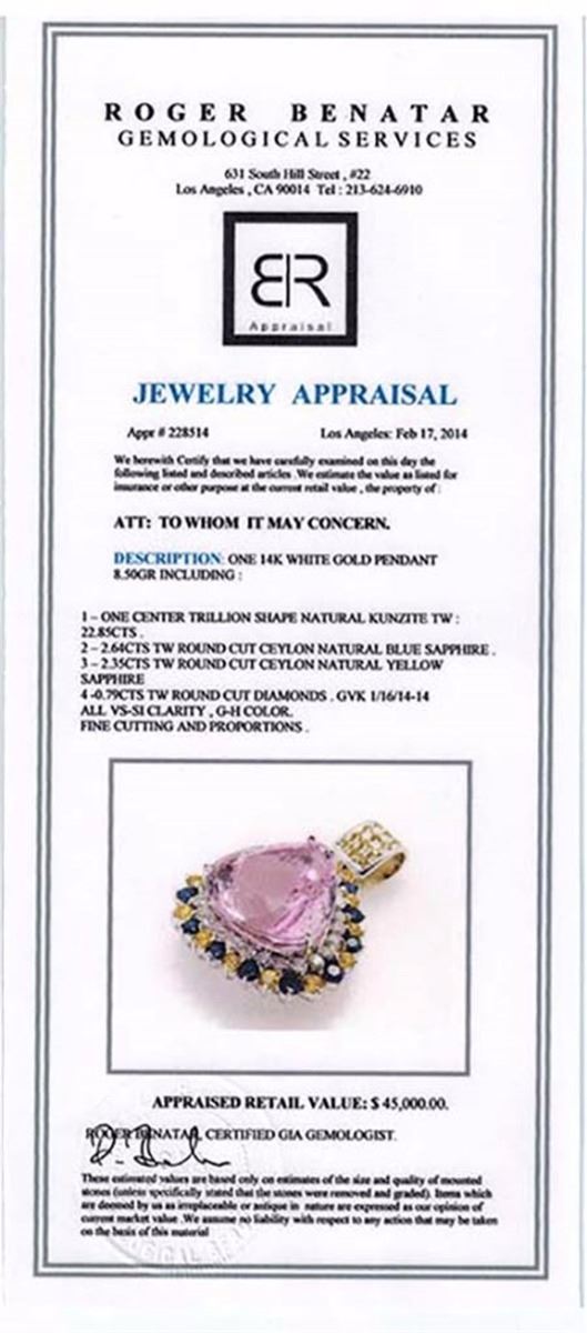 BLUE SAPPHIRE 2.64CT / YELLOW SAPPHIRE 2.35CT / KUNZITE 22.85CT, 14K W/G PENDANT 22.85GRAM / DIAMOND