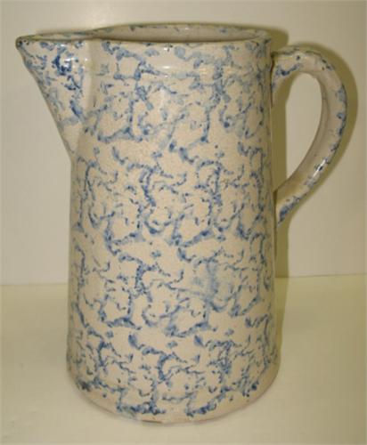 BLUE SPONGEWARE HANDLED PITCHER. Shows signs of crazing. One chip on end of spout. 9” H