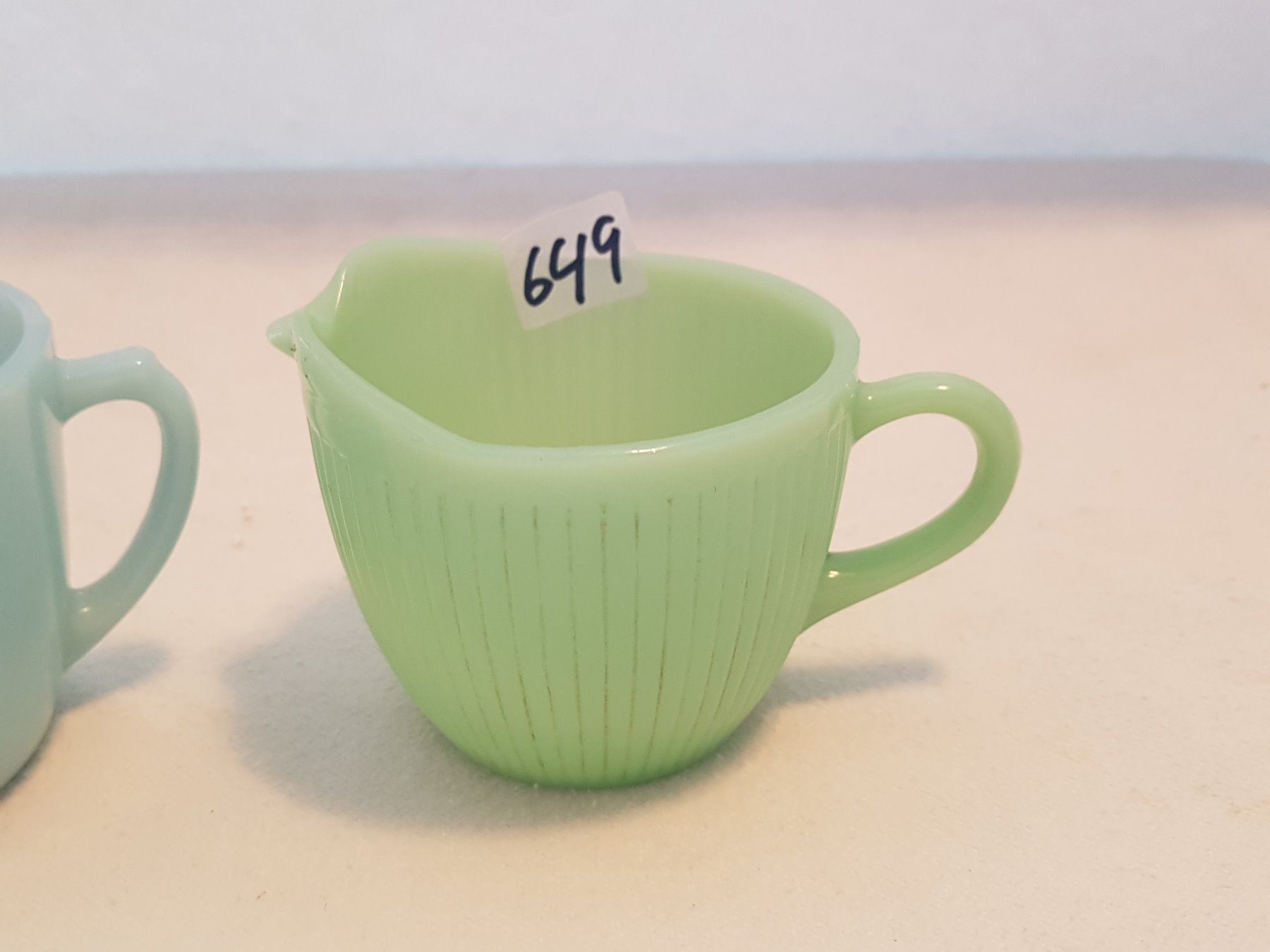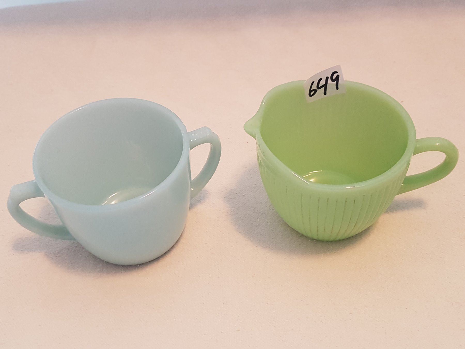 BLUE SUGAR BOWL AND GREEN CREAMER (FIREKING)