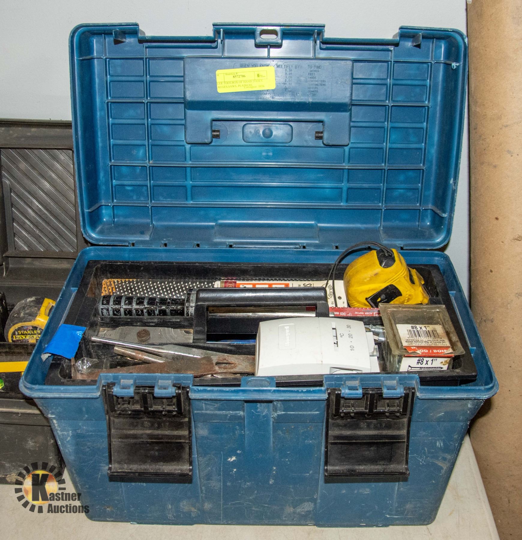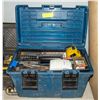 BLUE TOOLBOX OF HAND TOOLS, GAUGES,SAWS, PLAINERS
