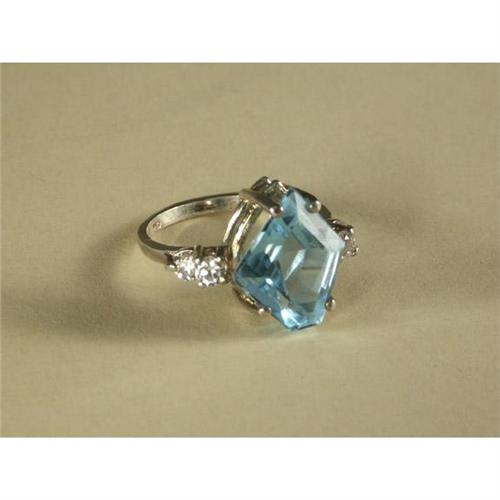 RING: Sterling silver lady's ring with a mixed cut Brazilian blue topaz flanked by two cubic zirconium on either side. The blue topaz measures approximately 9.00 cts. There is no appraisal included with this lot.