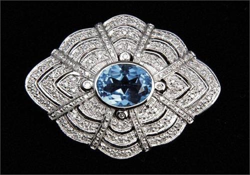 BLUE TOPAZ AND DIAMOND BROOCH. Beautiful 14kt white gold brooch is set with center oval cut 2.97ct blue topaz and is completely surrounded by three rows of single cut diamonds with a total weight of approx. .40ct. SIZE: Approx. 1-1/2" l x 1". CONDITION: Very good to excellent. 5-61907