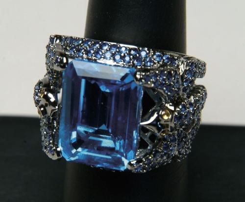 BLUE TOPAZ AND SAPPHIRE RING. Massive 18kt white gold setting has yellow gold figure of dragonfly on each side. The dragonfly is completely encrusted in blue sapphires as is the top edge of the white gold setting. The tips of the dragonfly's wings act as prongs to hold a beautiful emerald cut blue topaz which is 14.96cts. SIZE: 8. CONDITION: Very good to excellent. 5-61594