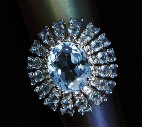 BLUE TOPAZ RING. Wonderful 14kt white gold ring is mounted with a center 9 x 11mm blue topaz surrounded by sixteen rows of smaller blue topaz. SIZE: Top of ring is 7/8" x 3/4". CONDITION: Very good to excellent. 5-61909