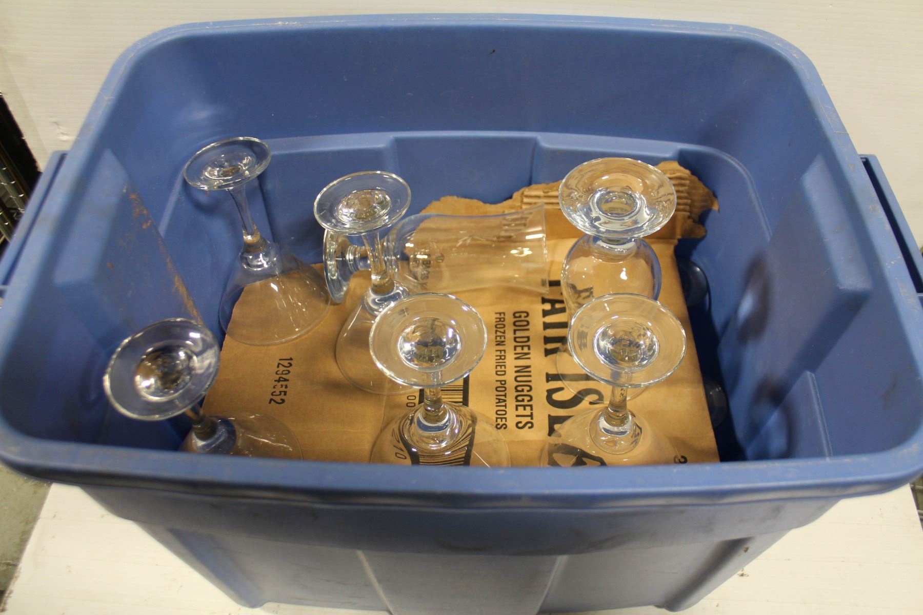BLUE TOTE FULL OF ASSORTED DRINK/ GLASSWARE