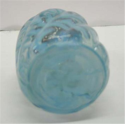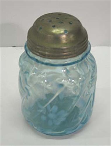 BLUE VICTORIAN GLASS SUGAR SHAKER. Floral opalescent and diagonal quilted design. Shows major roughness along top rim. 4.5” H