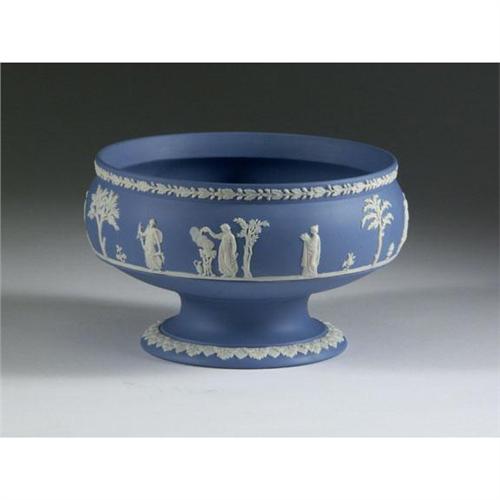 JASPERWARE: A Wedgwood blue jasperware pedestal bowl, allegorical scenes, acorn and oak leaf border, hallmarked, ''Wedgwood, Made in England'' on bottom, and date marked '79, 5'' x 8''.