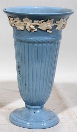 WEDGWOOD QUEENSWARE PORCELAIN VASE H 6 1/2in. Vase is light blue with a white accent