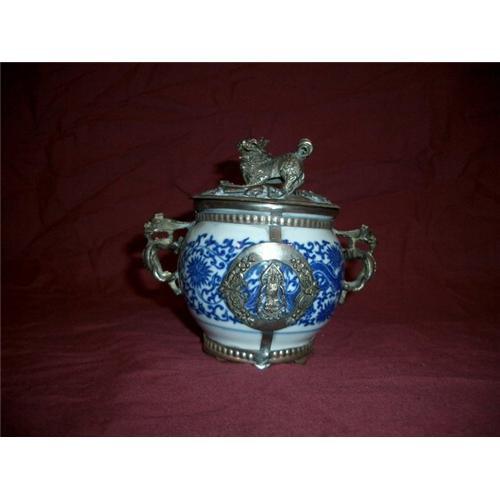 This antique we offered for you is a piece of Chinese porcelain incense burner collected Tianjin province in china.This piece is derived from middle Qing Dynasty.Its body was glazed blue & white,covered whit silver and there is a marking indicating the period of piece as Qianlong reign age foo dog at the lid & dragon handles
