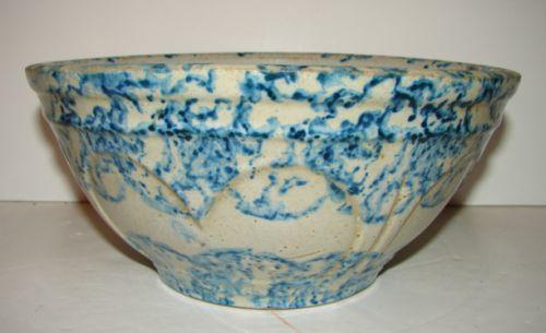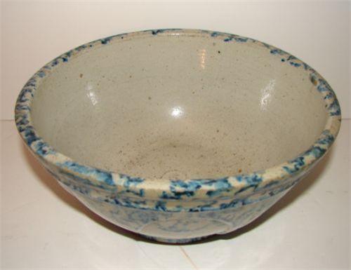 BLUE & WHITE SPATTERWARE BOWL. Shows some chipping along bottom rim. 4” H, 9” Dia.