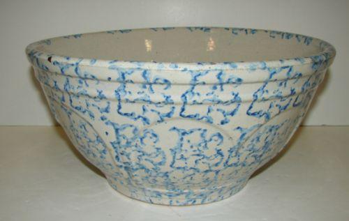 BLUE & WHITE SPLATTER WARE MIXING BOWL. Shows crazing throughout. Shows two tight vertical hairline cracks in interior and tight hairline crack at underside of base. 6” H, 12.75” Dia.
