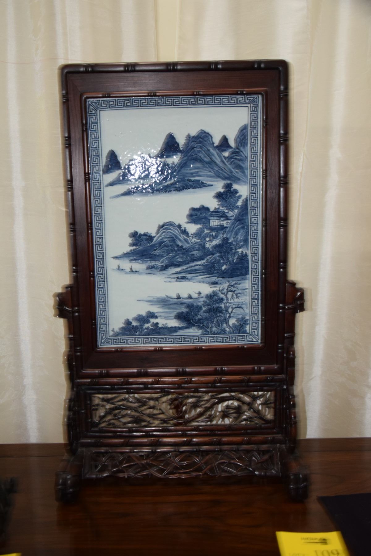 BLUE & WHITE TABLE SCREEN W/HIGHLY CARVED BASE