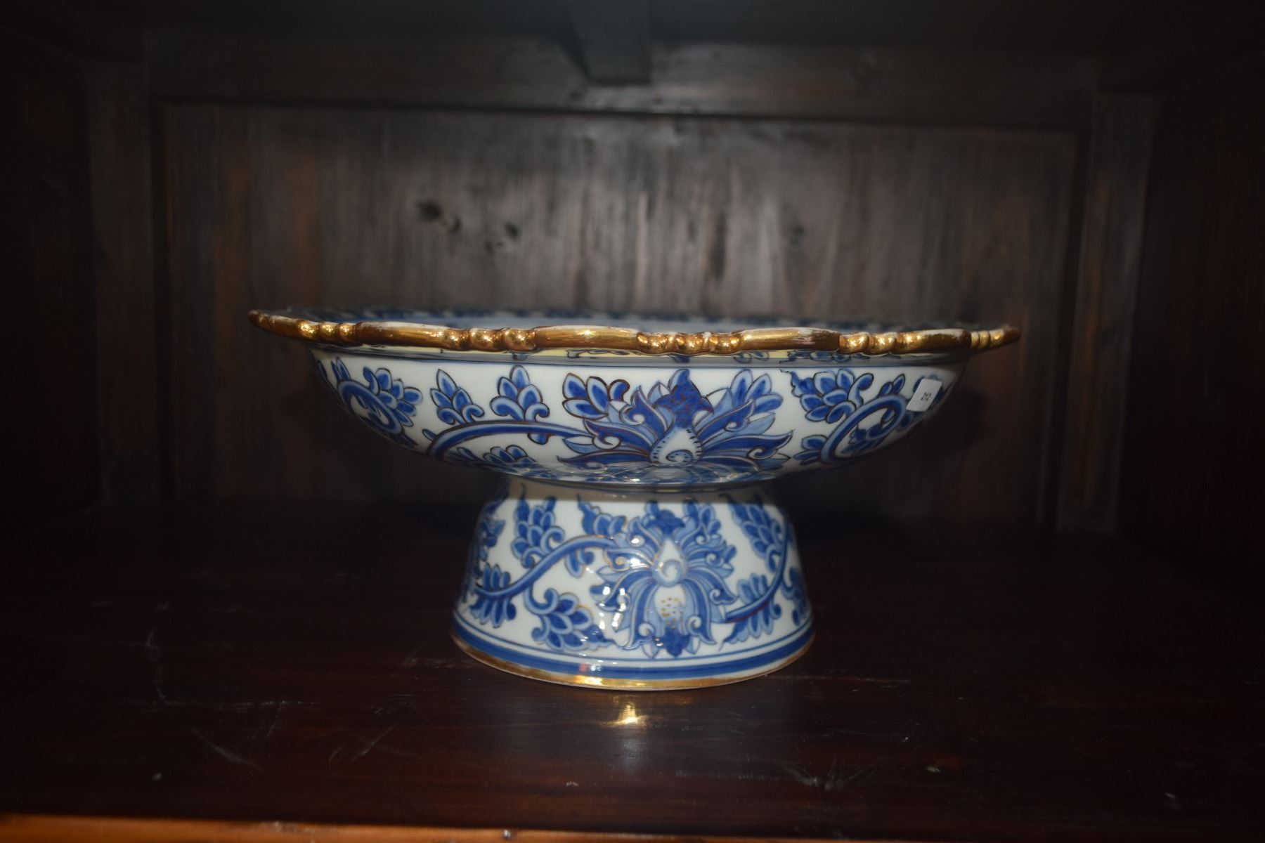 BLUE & WHITE THAI PEDESTAL FRUIT BOWL W/GOLD TRIM