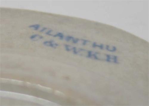 PAIR OF BLUE & WHITE TRANSFERWARE BUTTER PATS. Decorated with urn and valley scene. Marked on reverse “Ailanthu-C. & W.K.H.” and impressed illegibly. One pat shows discoloration. 4” Dia.