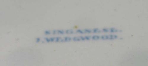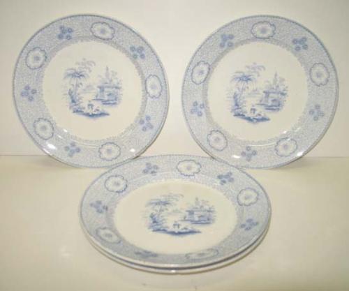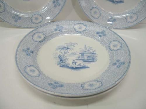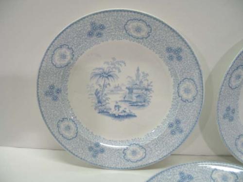 SET OF FOUR BLUE & WHITE TRANSFERWARE PLATES. Wedgwood. Decorated with man and woman along river. Marked on reverse “Singanese-J. Wedgwood” on two plates. Two plates are unmarked. 8.5” Dia.